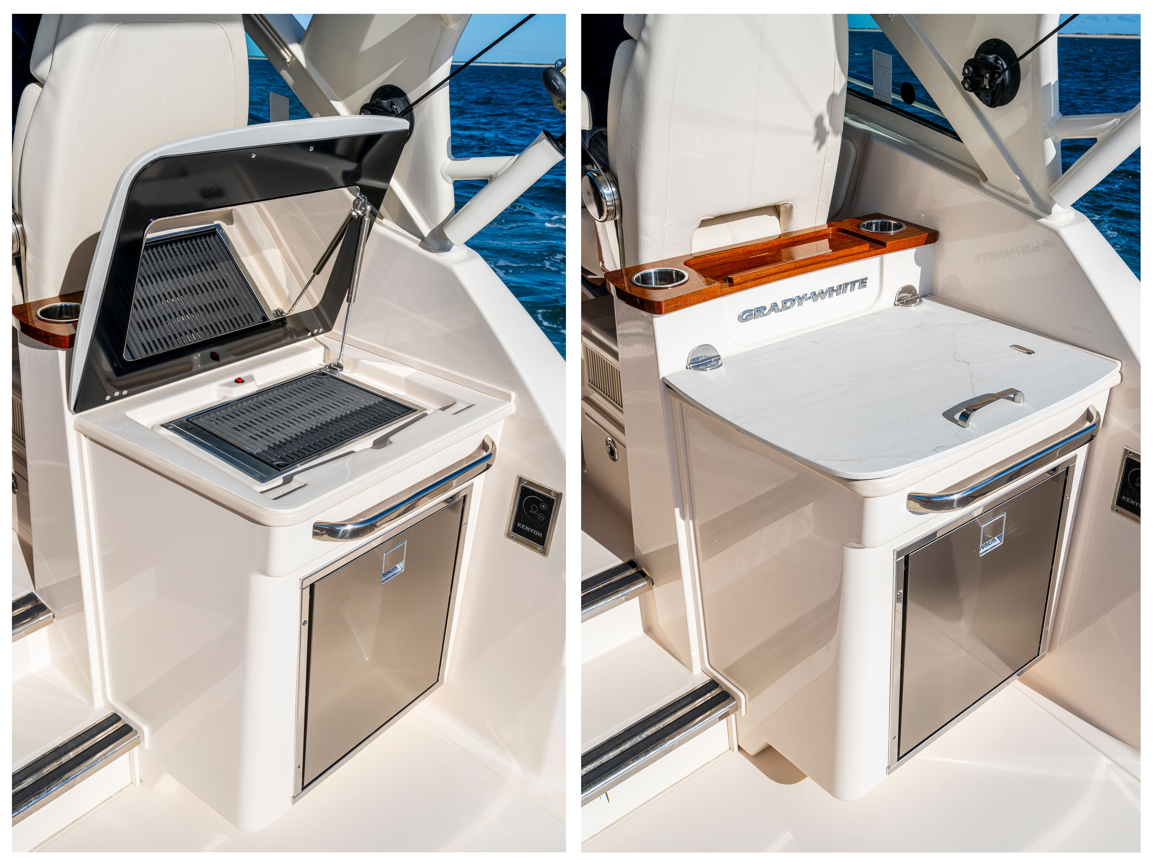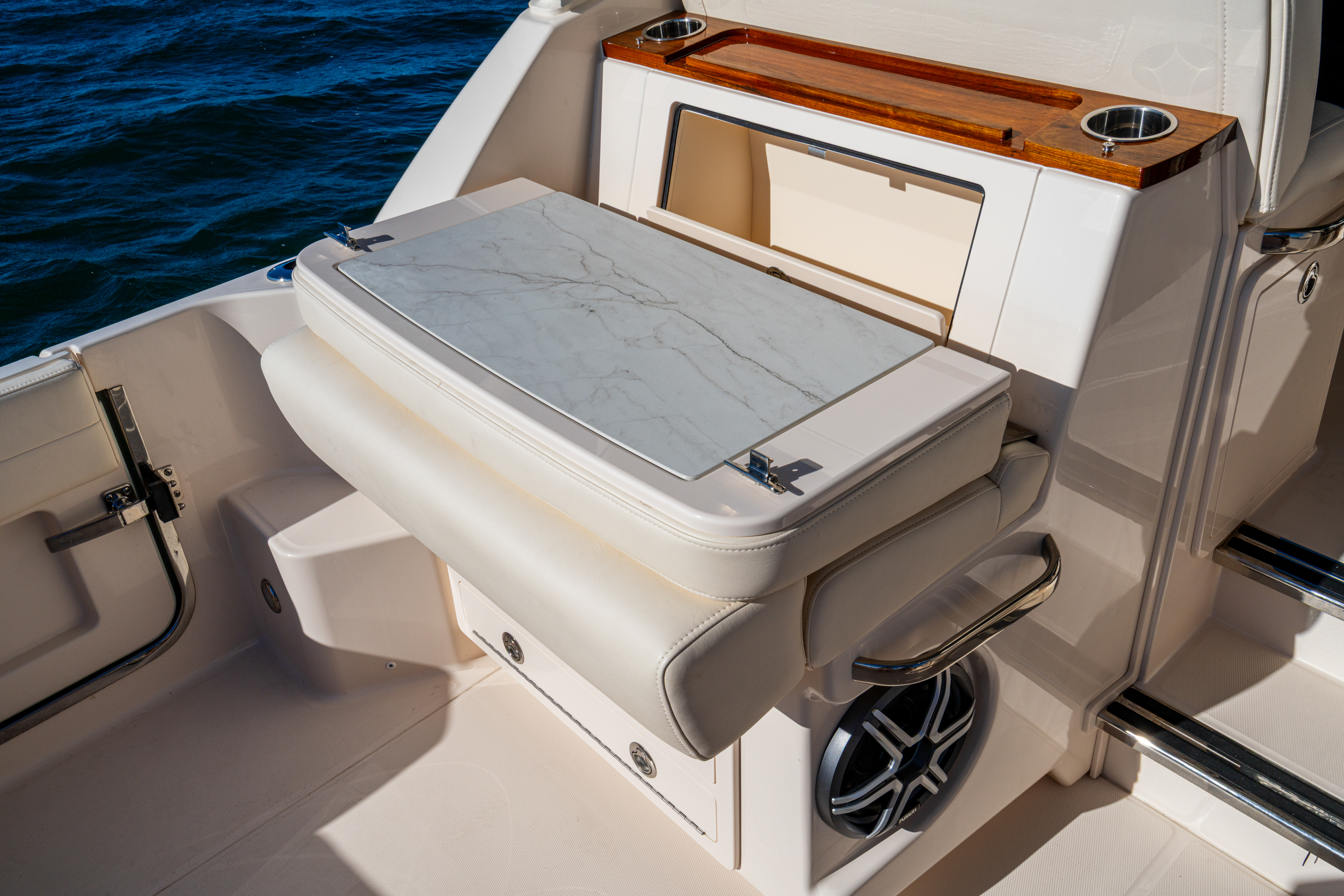 Seating - aft facing mezzanine seat w/flip-up bolster, fold-down Dekton® countertop, pull out footrest, tackle storage, drawer storage, and bulk storage w/USB and 120V outlets